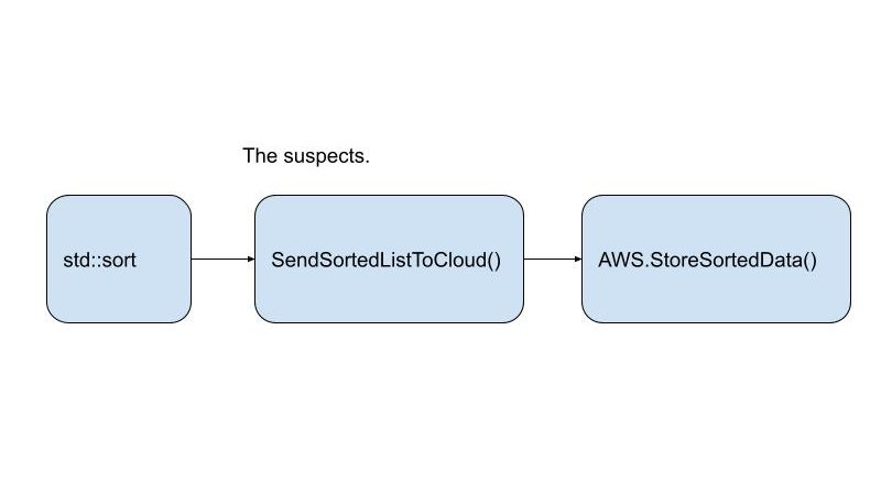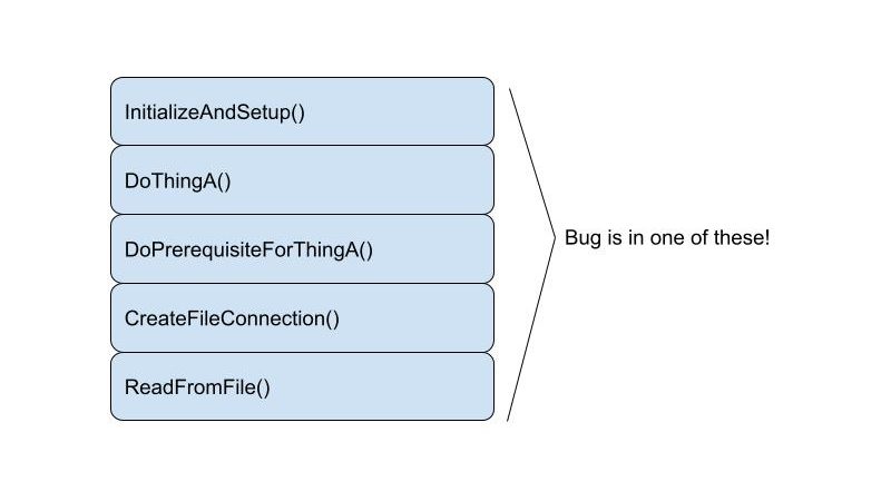 Let’s assume you have no idea where in this stack the bug happens, but you can add a check to see if it’s manifested at any given point in the program. You could drop this check at the end of any of these functions to see if the bug happened before that point.