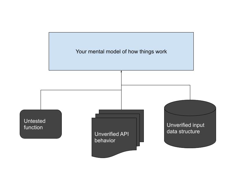 You are dealing with a complex system; your mental model of the system includes a set of “black boxes” and abstractions, and there are parts of it that you may not understand at all. Let’s call all of these, collectively, your assumptions. An assumption is any statement about the system that you have not directly verified – anything from “This function called Average always returns the average of its inputs” to “This API call returns or errors out with a 5 second timeout”.